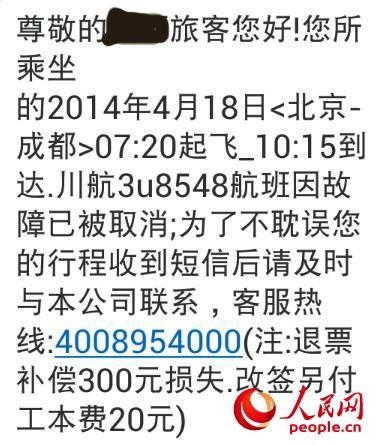 今年3月31日,记者在“去哪儿网”四川航空公司旗舰店,通过信用卡成功购买了4月19日北京飞往成都的机票。在起飞的前3天,记者收到一条0085264505097号码发来的短信,短信告知其所预订的航班已被取消,希望乘客与短信中提供的客服电话联系。